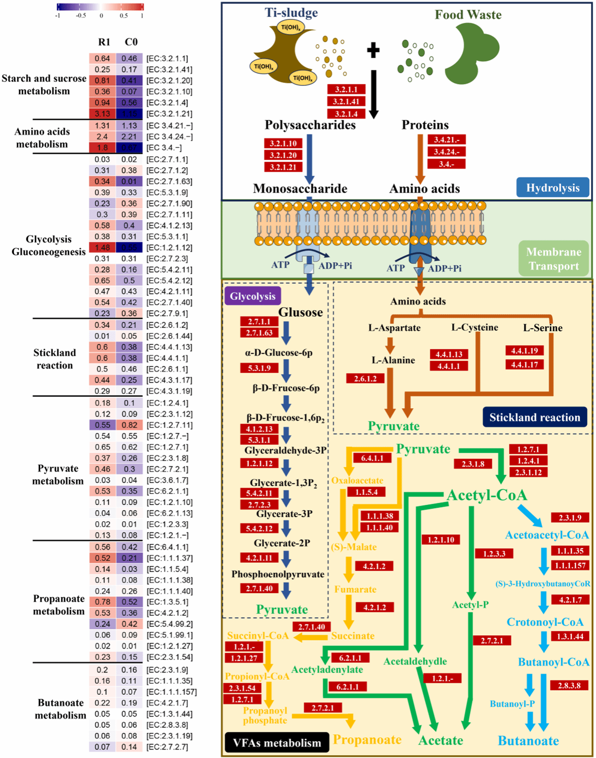 图 2 厌氧产酸发酵的代谢路径及酶对应的基因丰度对比、