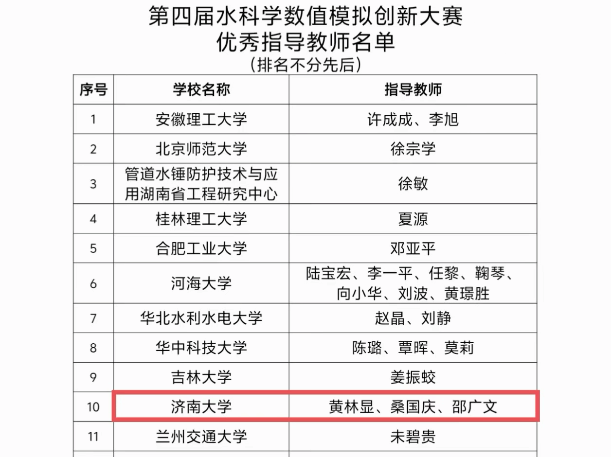 近日,第四届水科学数值模拟创新大赛圆满落幕,中国水利学会公布获奖名单。本次大赛共吸引了全国80多家高校、科研院所484支队伍报名参赛,经初赛、复赛、决赛角逐,最终评出一等奖10项、二等奖20项、三等奖43项及优秀奖73项。bat365官网登录入口参赛团队在本次大赛中获得一等奖1项、三等奖2项,荣获“优秀组织奖”。学院教师黄林显、桑国庆、邵广文获评“优秀指导教师”。