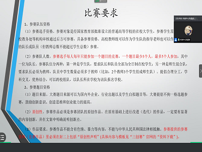 首先,张晨奇同学为大家具体讲解了本次大赛挑战各项具体内容,包括大赛简介、比赛时间、报名方式和流程、比赛要求、大赛主题要求、评分标准等方面,并鼓励感兴趣的同学尽快报名。随后,学术部王耀羚同学对创业计划书的选题原则以及大纲进行了详细的描述。在最后的提问解答环节中,同学们踊跃提问,王玉尧同学为大家进行一一解答,并祝愿报名的同学在大赛中能够取得优异的成绩。