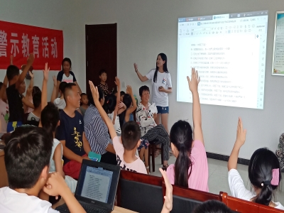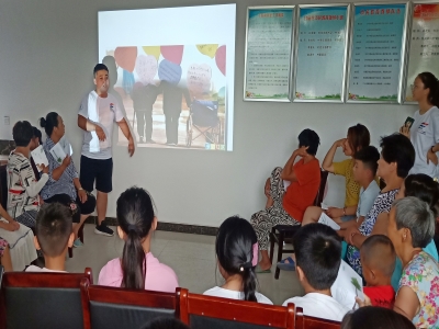 感恩教育和爱国宣讲活动前期,成员们分工明确,做足了准备工作。下午四点半,家长们陆陆续续带着小朋友们来到村委会,小朋友们被大屏幕上的动画人物吸引,实践团成员热情地与小朋友们聊天、做游戏,场内气氛活跃、一片欢声笑语。